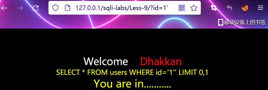 输入?id=1显示You are in,输入?id=1'显示You are in,输入?id=1)显示You are in,发现无论怎么闭合返回的页面都是一样的,说明不存在布尔盲注