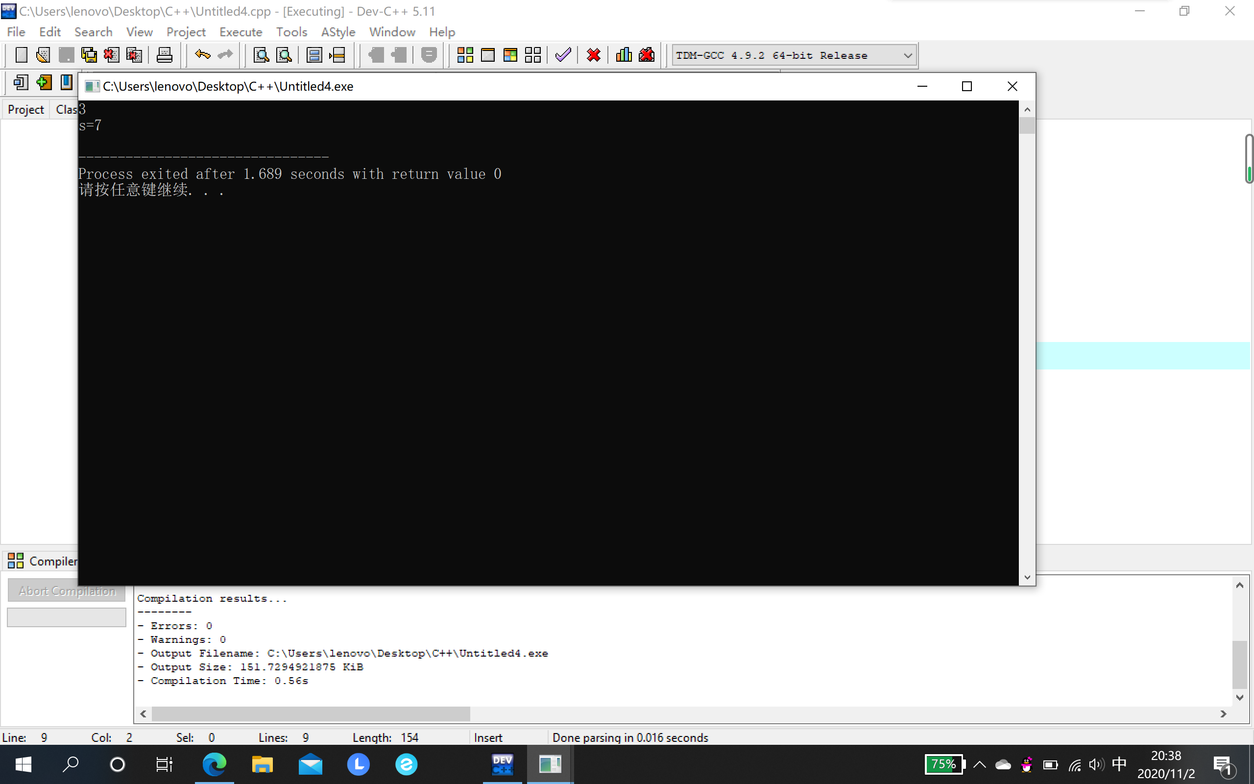 printf("s=%d\n",s);