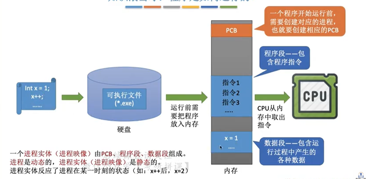 - 程序是静态的,是存放在磁盘里的指令集合;进程是动态的,是程序的一次执行过程