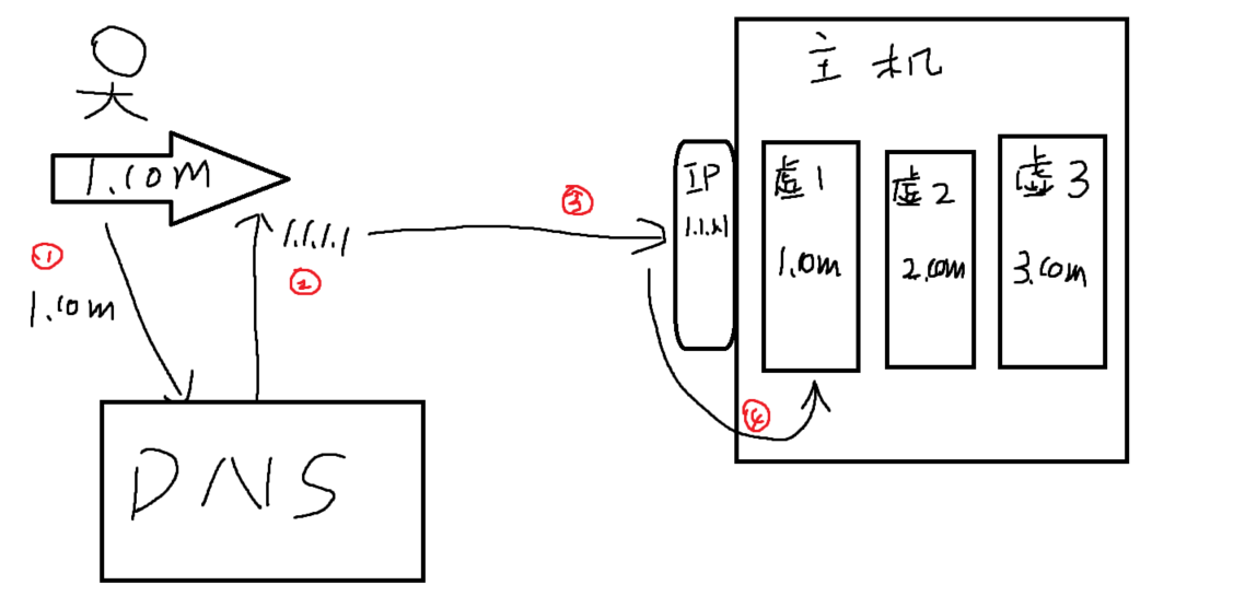 然后第三步,我们通过IP地址找到了目标主机,但是目标主机体内装有三个虚拟机,每一个虚拟机都架设了一个网站。假如这个时候没有host的话,我们就不知道请求哪一个虚拟机了。但是,因为我们有host!!对方主机一看到我们的host是