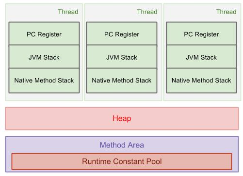 - MethodArea:方法区。一个Class文件加载出来那些字节码信息,就放在这里。方法区(Method Area)与Java堆一样,是各个线程共享的内存区域,它用于存储已被虚拟机加载 的类型信息、常量、静态变量、即时编译器编译后的代码缓存等数据。Class文件字节码信息放在方法区,加载出来的类实例放在堆区。这涉及到ClassLoader动态加载的问题了。