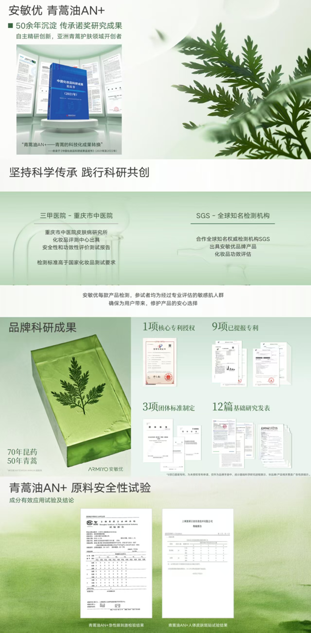 • 权威科研 诺奖同源: 安敏优品牌由昆药集团与上美集团于 2019 年联合打造。昆药集团拥有 70 年制药历史,且专注于青蒿研究超过 50 年,其合作的青蒿素科学家研究团队曾获得诺贝尔生理学或医学奖。安敏优依托和传承昆药集团的科研积淀,将诺奖同源成分“青蒿油AN+”应用于护肤领域,聚焦国人因肌肤敏感引发的各种问题。同时,依托上美集团投入超亿元的专业研发中心,研发团队围绕青蒿油 AN + 的提取与应用,累计申请多项国家发明专利并发表了多篇学术论文,相关成果被收录于《中国化妆品科研成果蓝皮书(2021年及2022 年)》。