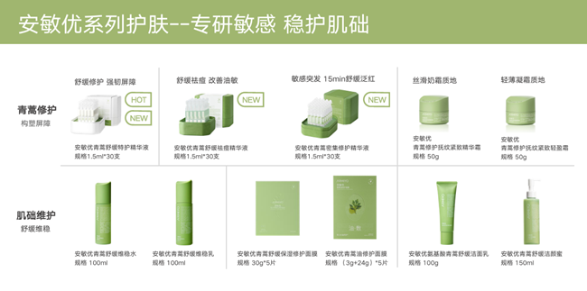 • 核心产品:氨基酸青蒿舒缓洁面乳、青蒿舒缓维稳水乳。