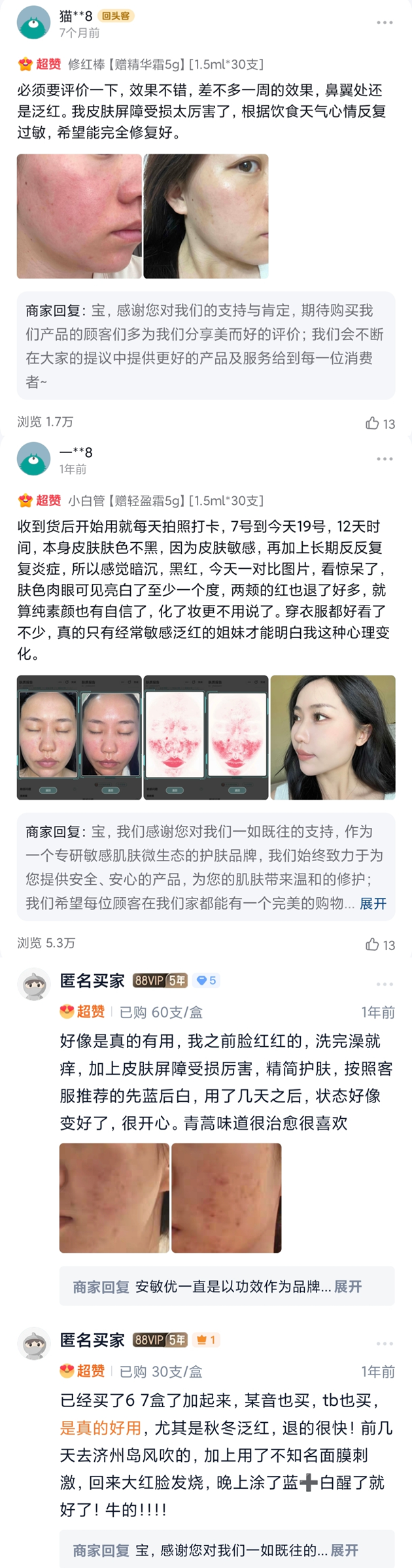 • 急救效果显著: “已经多次回购,累计购买 6、7 盒。尤其是换季过敏,脸上直接发烧,晚上涂了修红棒睡一觉就好了!”——这反映了产品在应急场景下的即时舒缓能力。