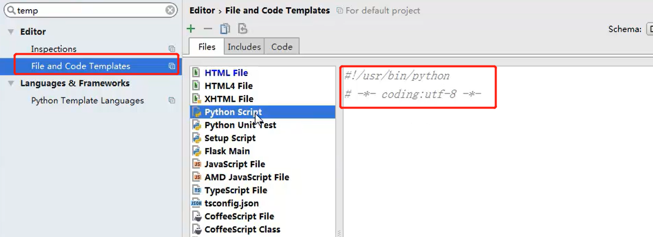 2设置头信息:file中找到default settings或者settings,搜索file and code templates,找到python script编辑输入
