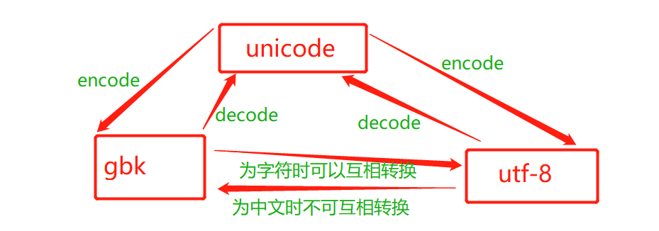 1 ==比较的是数据 is比较的是内存地址比较 2编码:不同编码之间的二进制是不能互相识别的,文件传输和存储不能用unicode,内存占用太大 ascii:数字,字母,特殊字符 字节:8位代表一个字符 字符:是内容的最小组成单位 abc:a代表一个字符 中国:中代表一个字符 unicode:万国码 四个字节代表一个字符 utf-8 最少用8位标识一个字符 a:8个字节 中:24个字节 数据类型;int bool str list dict tuple bytes str:编码默认为unicode bytes:编码非unicode,在内存编码看不懂 str文件存储传输必需先转换为bytes 编码方式必需和解码方式一致 str转换bytes用encode编码 bytes转换str转换用decode解码 s1 = "中国" b1 = s1.encode("utf-8") print(b1) # b'\xe4\xb8\xad\xe5\x9b\xbd' b2 = b1.decode("utf-8") print(b2) # 中国