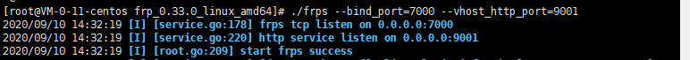 执行 ./frps --bind_port=7000 --vhost_http_port=9001 启动服务