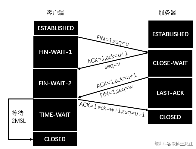 并且再次发送确认信息(ACK=1,ack=u+1,因为客户端已经不能发送数据了,服务器期望收到的序号永远都是最后一个序号+1,也就是u+1)
