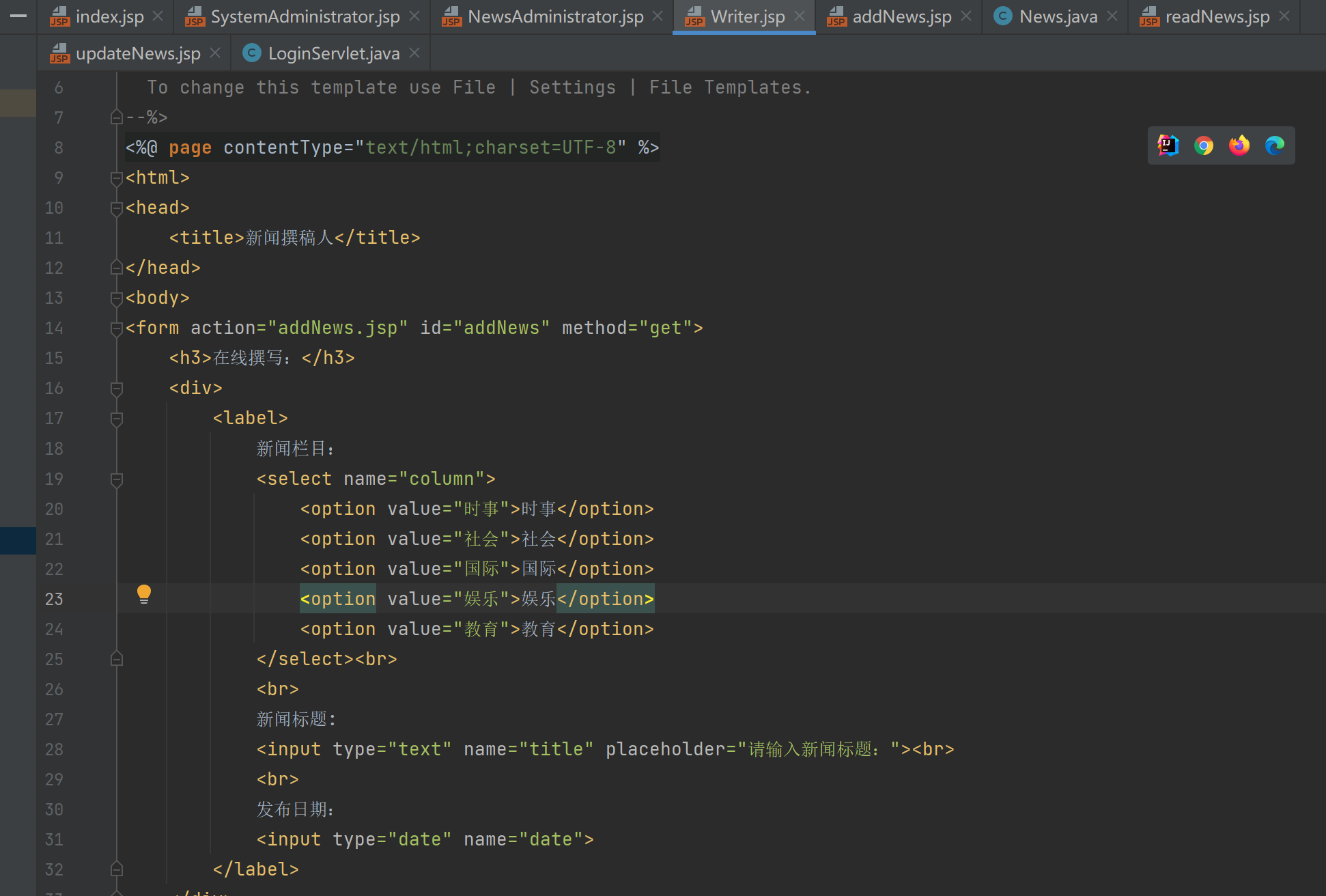 今天继续学习新闻发布系统的项目,刚开始想按照项目操作的顺序做不同用户角色权限的账号密码登录,但在网上查看了一些资料后,发现比较困难,所以我先开始制作增删改查的页面和功能,实现了新闻撰稿人的发布新闻的功能,期间遇到了一些问题,不能实现向添加类里添加空数据,对于单个角色来说现在实现的比较成功。