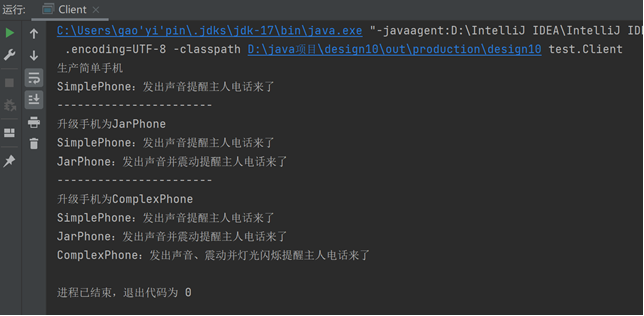 而JarPhone除了声音还能振动;更高级的手机(ComplexPhone)除了声音、振动外,还有灯光闪烁提示。