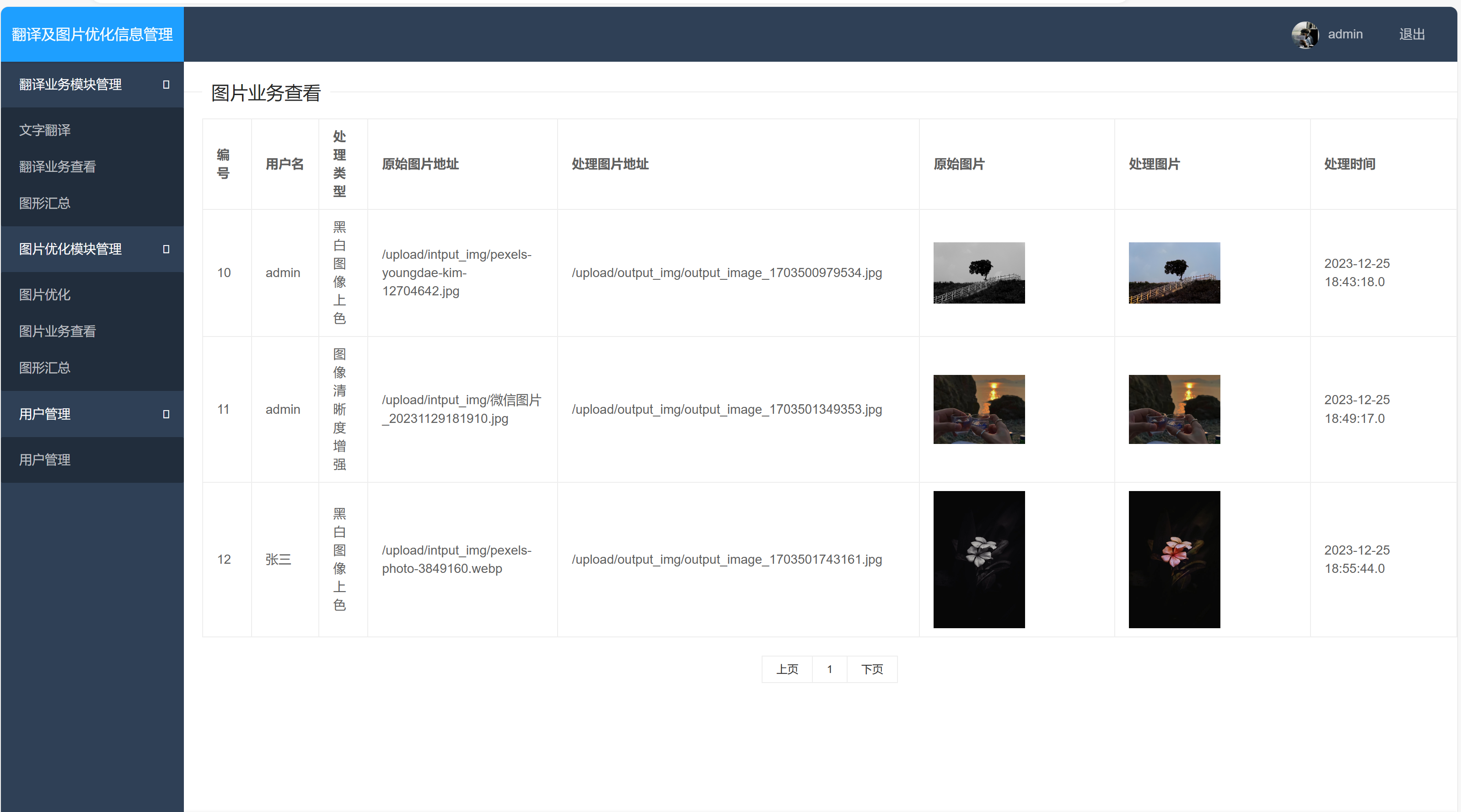 任务二:用户登录后可进行文字翻译和图片优化业务处理,并且可查看提交业务处理结果,时间,处理列表,图形汇总等。