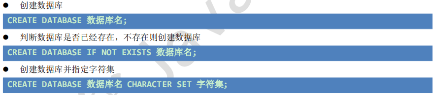 -- 直接创建数据库 db1 create database db1; -- 判断是否存在,如果不存在则创建数据库 db2 create database if not exists db2; -- 创建数据库并指定字符集为 gbk create database db3 default character set gbk;