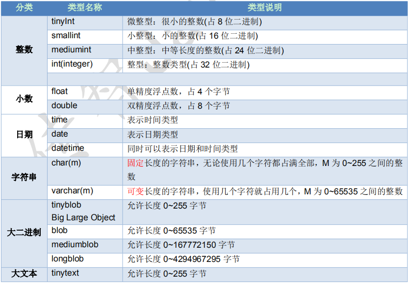 5.varchar:字符串 varchar(20):姓名最大20个字符