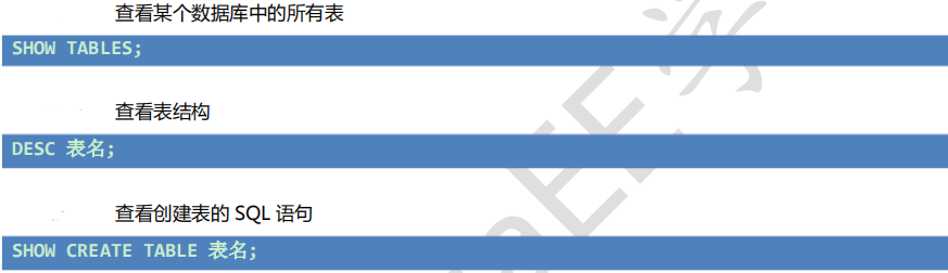 -- 查看 day21 数据库中的所有表 use day21; show tables; -- 查看 student 表的结构 desc student; -- 查看 student 的创建表 SQL 语句 show create table student;