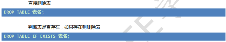 -- 直接删除表 s1 表 drop table s1; -- 判断表是否存在并删除 s1 表 drop table if exists s1;