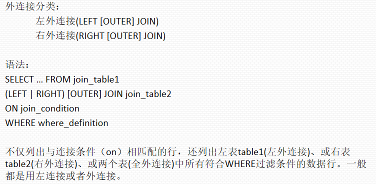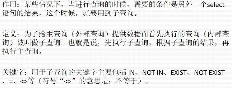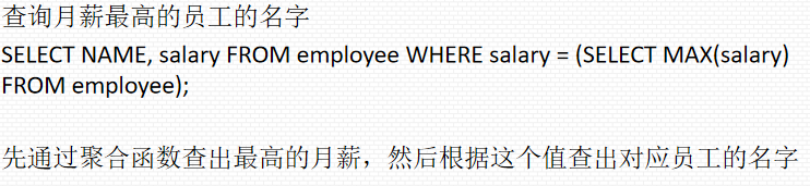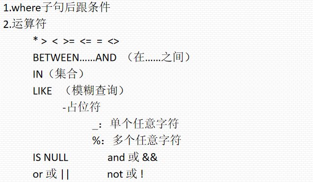 --查询年龄大于20岁: select * from student3 where age > 20; --查询年龄等于20岁: select * from student3 where age = 20; --查询年龄不等于20岁: select * from student3 where age != 20; select * from student3 where age <> 20; --查询年龄大于等于20,小于等于30: select * from student3 where age >= 20 && age <= 30; select * from student3 where age >= 20 and age <= 30; select * from student3 where age between 20 and 30; --查询年龄22岁,18岁,25岁的信息: select * from student3 where age= 22 or age = 18 or age = 25; select * from student3 where age in (22, 18, 25); --查询英语成绩为null select * from student3 where english = null; (不对,null值不能使用 = (!=) 判断) select * from student3 where english is null; --查询英语成绩不为null select * from student3 where english is not null; --查询姓马的有哪些?(like) select * from student3 where name like ‘马%’; --查询第二个字是‘化’的人 select * from student3 where name like “_化%”; --查询姓名是3个字的人 (几个字就写几个下划线) select * from student3 where name like “___”; --查询姓名中包含‘德’的人 select * from student3 where name like ‘%德%’;