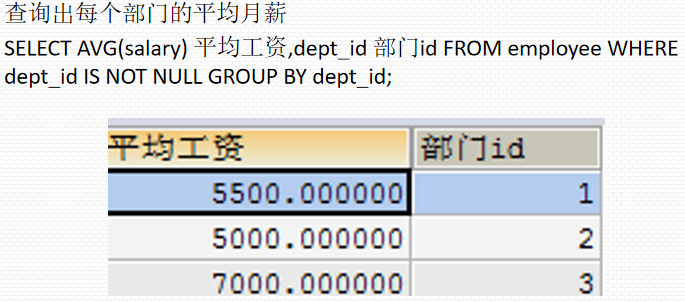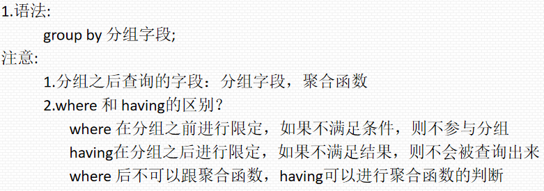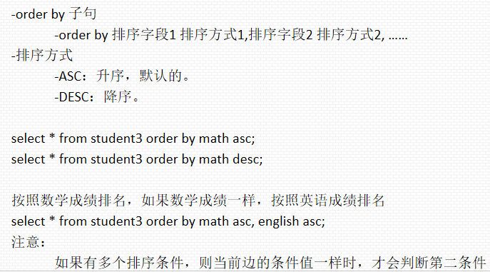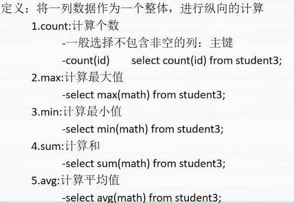 -- 按照性别分组,分别查询男,女同学的平均分 select sex, avg(math) from student3 group by sex; --按照性别分组,分别查询男,女同学的平均分,人数 select sex, avg(math), count(id) from student3 group by sex; --按照性别分组,分别查询男,女同学的平均分,人数 (要求:分数低于70分的人,不参与分组) select sex, avg(math), count(id) from student3 where math >70 group by sex; --按照性别分组,分别查询男,女同学的平均分,人数 (要求:分数低于70分的人,不参与分组,且分组之后要大于2个人) select sex, avg(math), count(id) from student3 where math >70 group by sex having count(id) > 2;