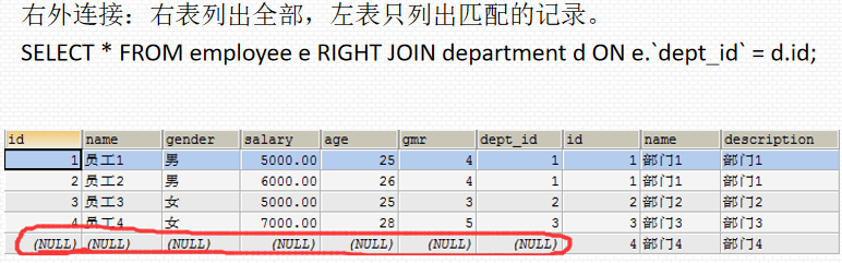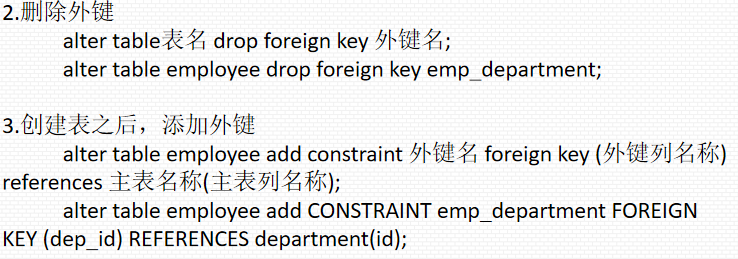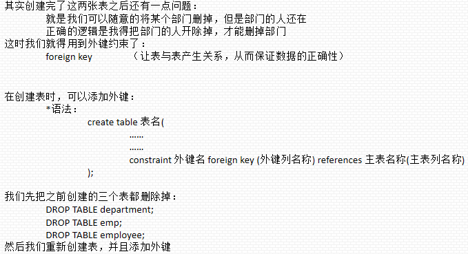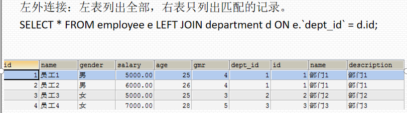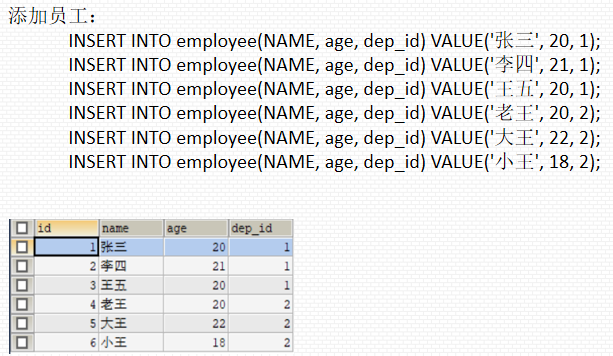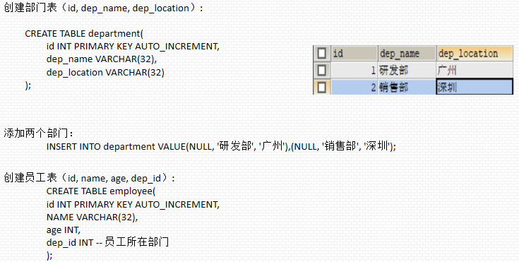 CREATE TABLE department( id INT PRIMARY KEY AUTO_INCREMENT, dep_name VARCHAR(32), dep_location VARCHAR(32) ); INSERT INTO department VALUE(NULL, '研发部', '广州'),(NULL, '销售部', '深圳'); CREATE TABLE employee( id INT PRIMARY KEY AUTO_INCREMENT, NAME VARCHAR(32), age INT, dep_id INT, -- 员工所在部门 CONSTRAINT emp_department FOREIGN KEY (dep_id) REFERENCES department(id) -- 重点 ); INSERT INTO employee(NAME, age, dep_id) VALUE('张三', 20, 1); INSERT INTO employee(NAME, age, dep_id) VALUE('李四', 21, 1); INSERT INTO employee(NAME, age, dep_id) VALUE('王五', 20, 1); INSERT INTO employee(NAME, age, dep_id) VALUE('老王', 20, 2); INSERT INTO employee(NAME, age, dep_id) VALUE('大王', 22, 2); INSERT INTO employee(NAME, age, dep_id) VALUE('小王', 18, 2);