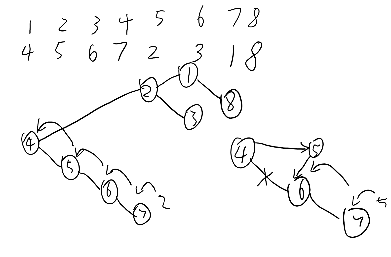 像这个图,首先把4扔进去,然后5进去,比较一下,大于4,你在4右边,并且比4小,4的右儿子是你,然后加入6,7同理,加入2的时候,2比他们都大,就弹栈到只剩下2,2发现左边没有比自己大的,即自己不会是别人的右儿子,也就是判断一下栈是否空,空了就不连,然后将自己的左儿子设成最后一个弹掉的,所以你每次维护的其实就是4 5 6 7这样一条链,如果有比他们小的,弹栈到合适位置,让比它小的给他连右儿子的边[新来的被之前的连边一定是右儿子],它的左儿子就是上一次弹出的点[单调栈,保证这个一定是最后一个比自己大的,也就是最小的,又是顺序扫,所以一定在自己左边,所以是左儿子]