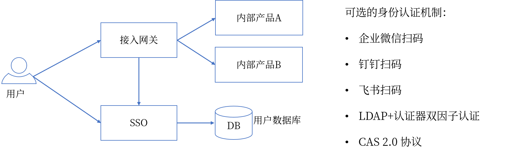 如果内部运营网站原本没有身份认证机制,这些认证机制可直接在应用网关上启用,而内部运营网站可以保持原样,不用任何改进。启用后,员工访问内部网站,会要求身份认证(跳转到指定的身份认证服务提供商),通过后才能访问后端网站。