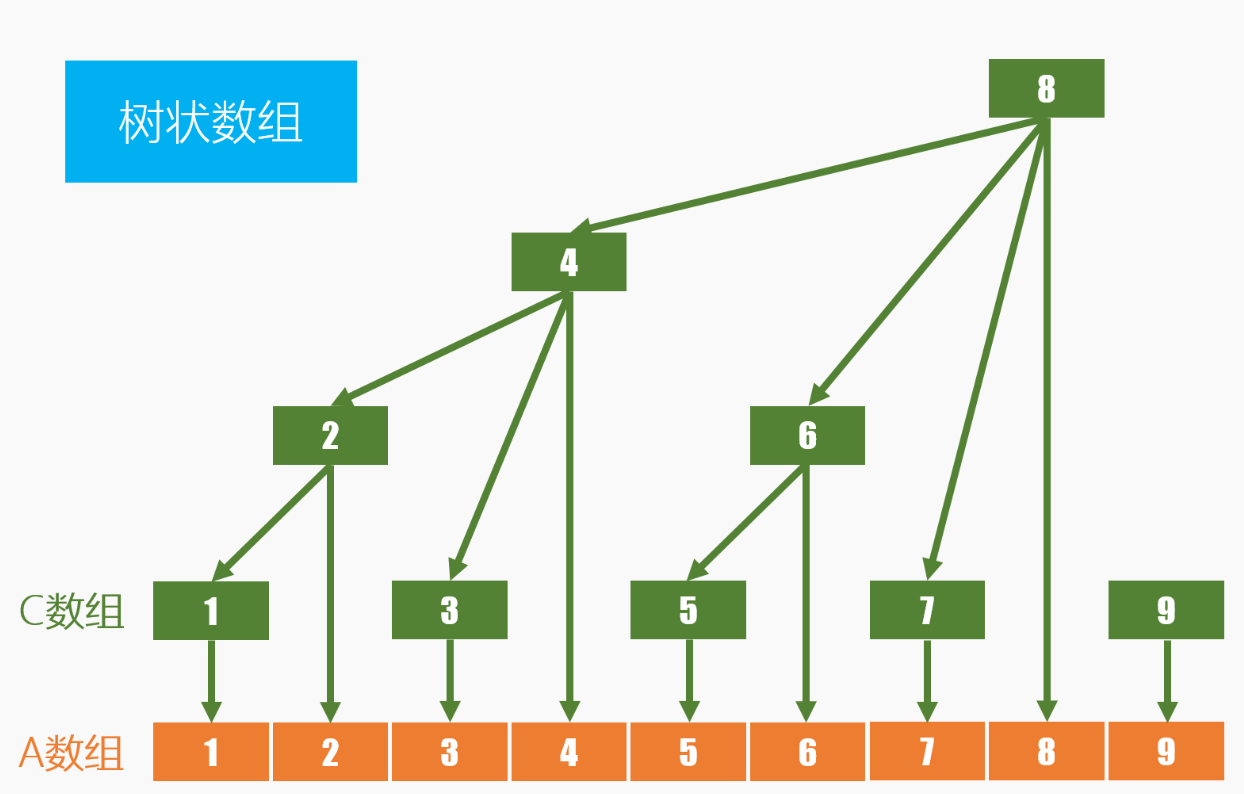 可以发现:c[1]=a[1];c[2]=a[1]+a[2];c[3]=a[3];c[4]=c[2]+a[3]+a[4]=a[1]+a[2]+a[3]+a[4];c[5]=a[5];c[6]=a[5]+a[6];c[7]=a[7];c[8]=c[4]+c[6]+a[7]=a[1]+a[2]+...+a[8]。