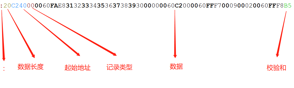 Hex文件每一行数据全部由十六进制数字组成,包含 :、数据长度、起始地址、记录类型、数据、校验和六个部分。