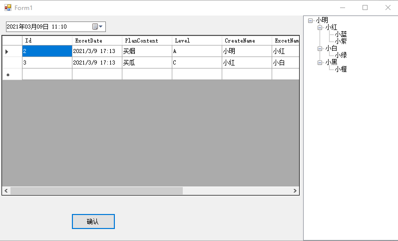 1 private void Form1_Load(object sender, EventArgs e) 2 { 3 string connect = "Data Source=DESKTOP-92RUK0U; Initial Catalog = EmployeeManager; Integrated Security = True"; 4 mssql = new MssqlFactory(connect); 5 if (mssql.ConnectionTest()) 6 MessageBox.Show("连接成功"); 7 string sql = @"select EmployeeId,Name,Password,Position,LeaderId,IsManager from Employee"; 8 DataTable dt = mssql.ExecuteDataTable(sql); 9 TreeNode treeNode = new TreeNode(); 10 treeNode.Text = "小明"; 11 treeNode.Tag = 100001; 12 treeView1.Nodes.Add(treeNode); 13 BindTree(100001,dt,treeNode); 14 treeView1.ExpandAll();//展开treeView 15 treeView1.SelectedNode = treeView1.Nodes[0];//默认选中第一个节点 16 } 17 18 /// <summary> 19 /// 递归传回所有数据 20 /// </summary> 21 /// <param name="employeeId"></param> 22 /// <param name="dt"></param> 23 /// <param name="node"></param> 24 private void BindTree(int employeeId ,DataTable dt ,TreeNode node) 25 { 26 DataRow[] rows = dt.Select($"LeaderId={employeeId}"); 27 foreach (DataRow row in rows) 28 { 29 TreeNode childNode = new TreeNode(); 30 childNode.Text = row["Name"].ToString(); 31 int num = Convert.ToInt32(row["EmployeeId"]); 32 childNode.Tag = num; 33 node.Nodes.Add(childNode); 34 BindTree(num, dt, childNode); 35 } 36 } 37 38 private void Search() 39 { 40 DateTime excetTime = dateTimePicker2.Value; 41 int id = (int)treeView1.SelectedNode.Tag; 42 string sql = @"select [Id], [ExcetDate], [PlanContent], [Level], b.Name as CreateName, c.Name as ExcetName,(case IsRemind when 1 then '是' else '否' end) [IsRemind], [RemindDate],(case IsValid when 1 then '是' else '否' end)[IsValid] from PlanManage a 43 left join Employee b 44 on(a.CreateNo=b.EmployeeId ) 45 left join Employee c 46 on(a.ExcetNo=c.EmployeeId ) 47 where convert(varchar,ExcetDate ,111)=convert(varchar,@ExcetDate,111)"; 48 sql += "and (a.CreateNo = @id or a.ExcetNo = @id)"; 49 SqlParameter[] paras = 50 { 51 new SqlParameter ("@ExcetDate",excetTime), 52 new SqlParameter ("@id",id), 53 }; 54 this.dataGridView1.DataSource = mssql.ExecuteDataset(sql,paras); 55 }