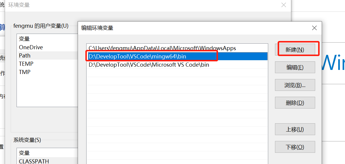 配置对象:WinGW,所以把你刚刚解压好的WinGW的bin文件路径拷贝一下,添加到用户环境变量中