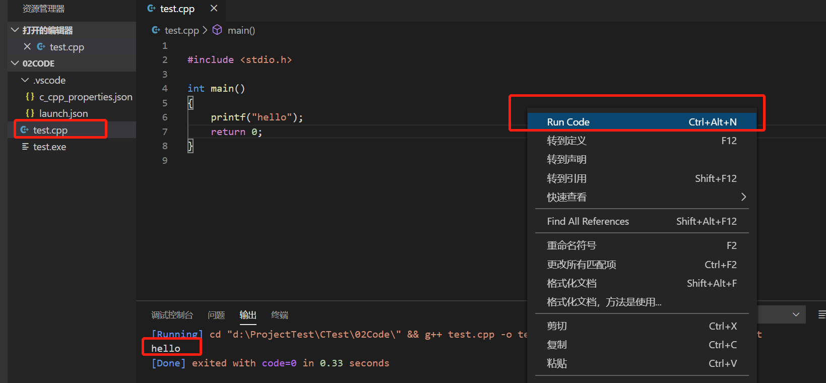 打开一个空文件夹,新建一个test.cpp文件,点击Run Code ,输出 hello,简单的输出测试完成。