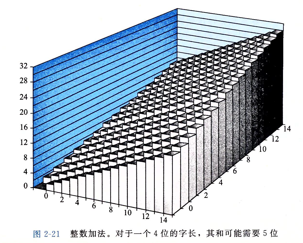 考虑两个非负整数x和y,满足0<=x,y<2w-1。每个数都能表示为w位无符号数字。然而,如果计算它们的和,我们就有一个可能的范围0<=x+y<=2w+1-2。表示这个和可能需要w+1位。例如,图示展示了当x和y有4位表示时,函数x+y的坐标图。参数(显示在水平轴上)的取值范围为0~15,但是和的取值范围为0~30。如果保持和为一个w+1位的数字,并且把它加上另外一个数值,我们可能需要w+2个位,以此类推。这种持续的“字长膨胀”意味着,要想完整的表示算术运算的结果,我们不能对字长做任何限制。一些编程语言,例如Lisp,实际上就支持无限精度的运算,允许任意的(在机器的内存限制内)整数运算。更常见的是,编程语言支持固定精度的运算,因此像“加法”和“乘法”这样的运算不同于它们在整数上的相应运算。