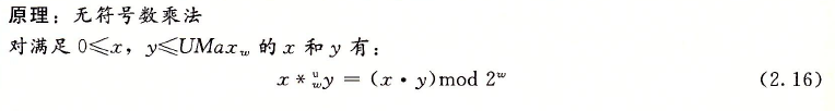 范围在0 <=x,y<=2w-1内的整数x和y可以被表示为w位的无符号数,但是它们的乘积x*y的取值范围为0到(2w-1)2=22w-2w+1+1之间。这可能需要2w位来表示。不过,C语言中的无符号乘法被定义为产生W位的值,就是2W位的整数乘积的低w位表示的值。