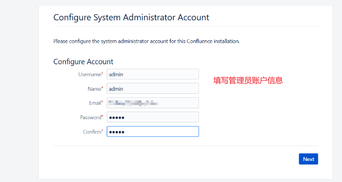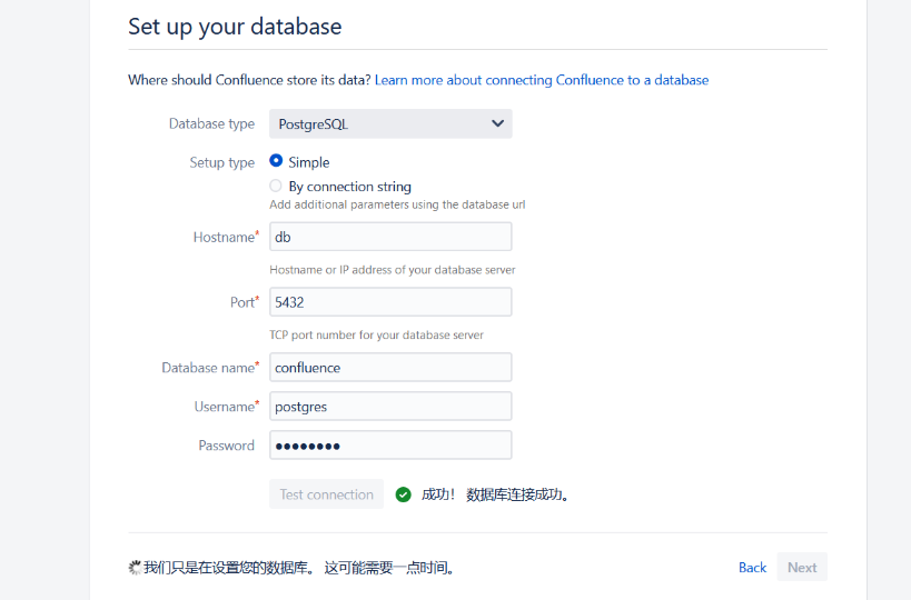 在填写数据库信息的页面,PostgreSQL数据库地址为db,数据库名称confluence,用户名密码均为postgres。