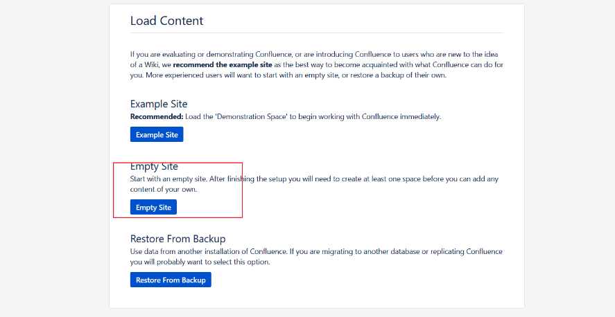 经过一段时间的加载之后,显示如下页面,在这一步失败了好几次,每次连接后台服务都会down,可能是因为虚拟机内存导致。我们选择Empty Site