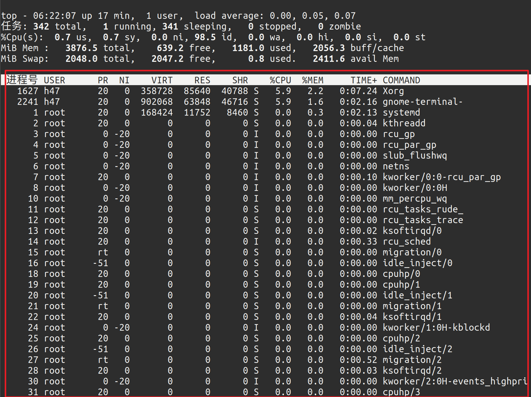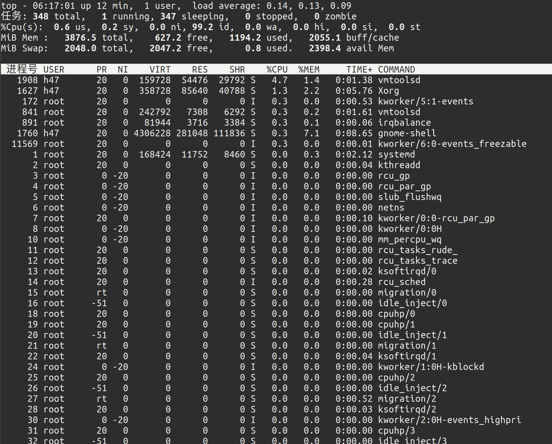 上图中是在刚启动 linux ,并无进程运行的情况下执行的 top,故无任务行,采用其它有跑任务的虚拟机的 top 输出作为示例,如下图: