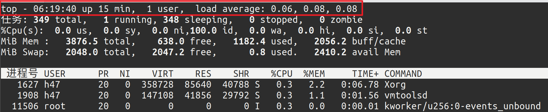 top - 06:19:19:top命令的启动时间,即我是在早上 06:19:19 开始运行top命令的up 14 min: 表示系统已经运行了 14 分钟1 user: 表示当前有一个用户登录到系统load average 0.01, 0.08, 0.08: 系统的平均负载值。 它给出了系统在过去 1 分钟、5 分钟和 15 分钟内的平均负载