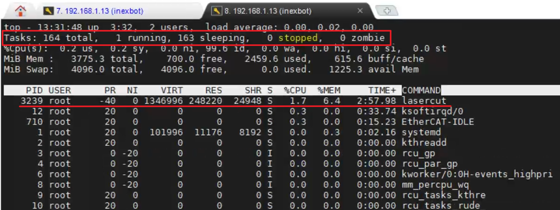 Task: 164 total: 这表示系统中共有 164 个任务(或进程)1 running: 当前有 1 个进程正在运行(占用 CPU 时间)163 sleeping: 有 163 个进程处于睡眠状态(等待某个条件发生,如 I/O 操作完成)0 stopped: 没有进程处于停止状态(通常是由于接收到 SIGSTOP 信号)0 zombie: 没有僵尸进程(已经终止但父进程尚未读取其终止状态的进程)