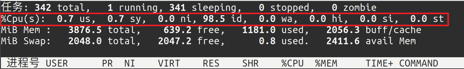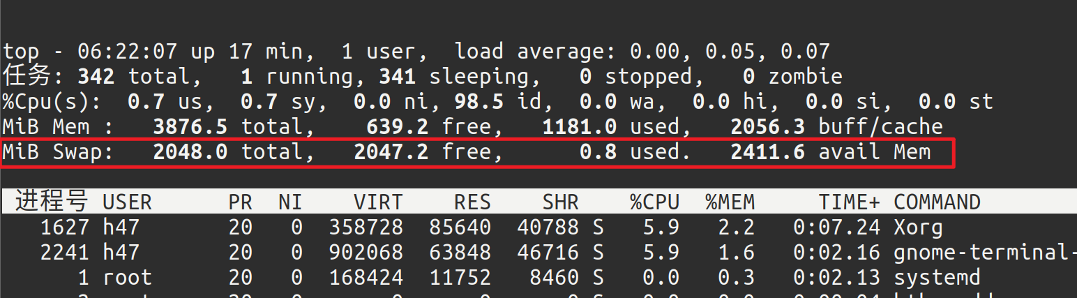 Total:2048.0 MiB: 总交换空间为 2048.0 兆字节Free:2047.2 MiB: 当前空闲的交换空间为 2047.2 兆字节Used:0.8 MiB: 已使用的交换空间为 0.8 兆字节Avail Mem:2411.6 MiB: 当前系统可用的内存总量为 2411.6 兆字节