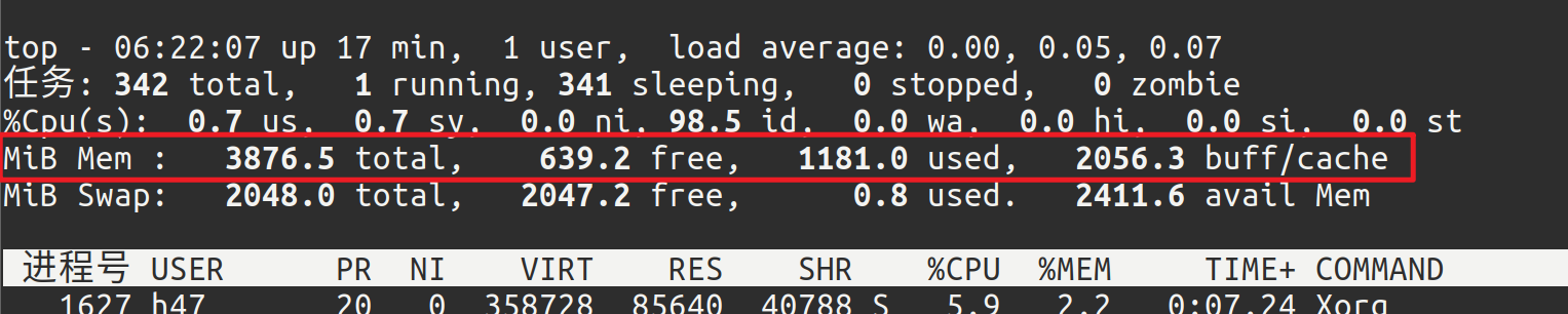MiB Mem: 这表明以下的数值是以 Mib (兆字节) 为单位的内存使用情况3876.5 total: 系统上总的物理内存是 3876.5 MiB639.2 free: 当前空闲的、未被使用的物理内存是 639.2 MiB1181.0 used: 当前被进程占用的物理内存是 1181.0 MiB。这通常包括应用程序、操作系统内核和其它运行中的进程所使用的内存2056.3 buff/cache: 这部分内存被用作文件系统和内核缓冲区以及缓存。虽然这部分内存被标记为 "已使用",但它实际上是可以在需要时快速释放给应用程序的,因为它主要存储的是可以重新从磁盘或其它来源获取的数据。因此,这部分内存实际上是 "可用" 的,只是在短期内被用来提高系统性能