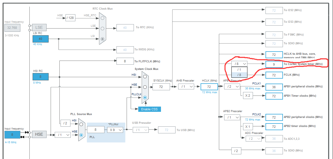 Systick的时钟来源有两个:HCLK 或者HCLK的8分频