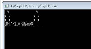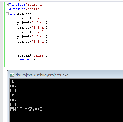 #include<stdio.h> #include<stdlib.h> int main(){ printf(" 0\n"); printf("<H>\n"); printf("I I\n"); printf(" 0\n"); printf("<H>\n"); printf("I I\n"); system("pause"); return 0; }