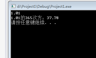 #include<stdio.h> #include<stdlib.h> #include<math.h> int main(){ double x,ans; scanf_s("%lf",&x); ans=pow(x,365); printf("%.2f的365次方:%.2f\n",x,ans); system("pause"); return 0; }