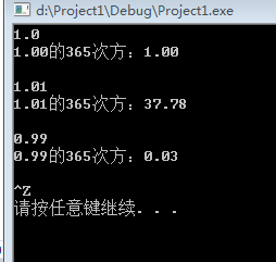 #include<stdio.h> #include<stdlib.h> #include<math.h> int main(){ double x,ans; while(scanf_s("%lf",&x)!= EOF) { ans=pow(x,365); printf("%.2f的365次方:%.2f\n",x,ans); printf("\n"); } system("pause"); return 0; }