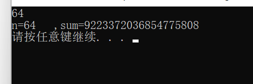#include<stdio.h> #include<math.h> #include<stdlib.h> int main() { int n; unsigned long long sum; scanf_s("%d", &n); sum = (1 - pow(2, n)) / (-1); printf("n=%d ,sum=%llu \n", n, sum); system("pause"); return 0; }