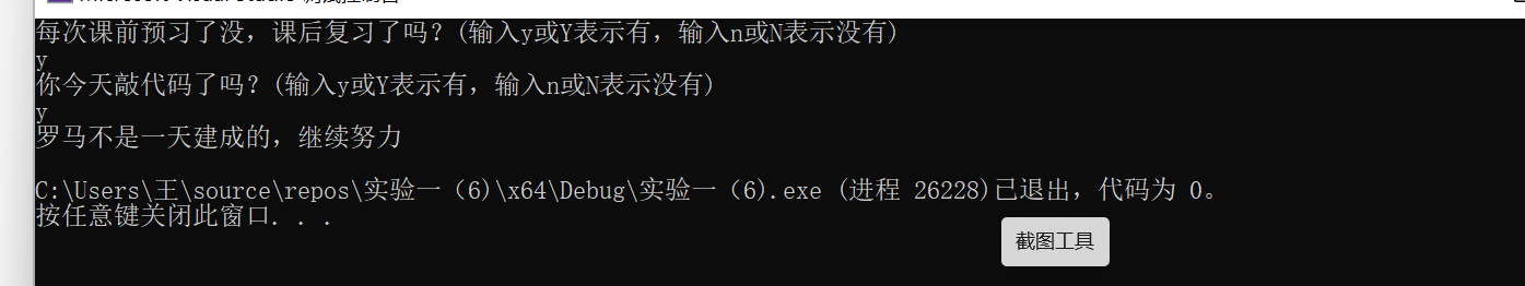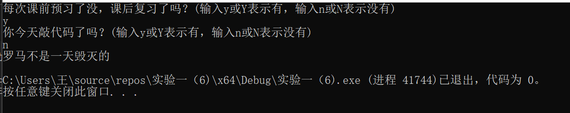 #include<stdio.h> int main() { char ans1, ans2; printf("每次课前预习了没,课后复习了吗?(输入y或Y表示有,输入n或N表示没有)\n"); ans1 = getchar(); getchar(); printf("你今天敲代码了吗?(输入y或Y表示有,输入n或N表示没有)\n"); ans2 = getchar(); getchar(); if ((ans1 == 'y' || ans1 == 'Y') && (ans2 == 'y' || ans2 == 'Y')) printf("罗马不是一天建成的,继续努力\n"); else printf("罗马不是一天毁灭的\n"); return 0; }