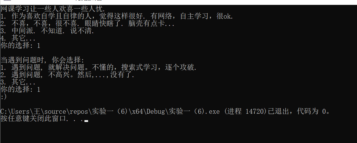 #include<stdio.h> int main() { int answer; char words[3000]; printf("网课学习让一些人欢喜一些人忧.\n"); printf("1. 作为喜欢自学且自律的人,觉得这样很好. 有网络,自主学习,很ok.\n"); printf("2. 不喜,不喜,很不喜. 眼睛快瞎了. 脑壳有点卡...\n"); printf("3. 中间派. 不知道. 说不清.\n"); printf("4. 其它...\n"); printf("你的选择: "); scanf_s("%d", &answer); if (answer == 4) { printf("请补充说明你的想法\n"); getchar(); gets_s(words); } printf("\n"); printf("当遇到问题时, 你会选择:\n"); printf("1. 遇到问题, 就解决问题。不懂的,搜索式学习,逐个攻破.\n"); printf("2. 遇到问题, 不高兴。然后,...,没有了.\n"); printf("3. 其它...\n"); printf("你的选择: "); scanf_s("%d", &answer); if (answer == 1) { printf(":)\n"); } else if (answer == 2) printf("这样不能解决问题啊...我们选择1好不好:)\n"); else if (answer == 3) { printf("请补充你的看法\n"); getchar(); gets_s(words); } return 0; }