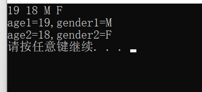 #include<stdio.h> #include<math.h> #include<stdlib.h> int main() { int age1, age2; char gender1, gender2; scanf("%d %d %c %c", &age1, &age2, &gender1,&gender2); printf("age1=%d,gender1=%c\n", age1, gender1); printf("age2=%d,gender2=%c\n", age2, gender2); system("pause"); return 0; }