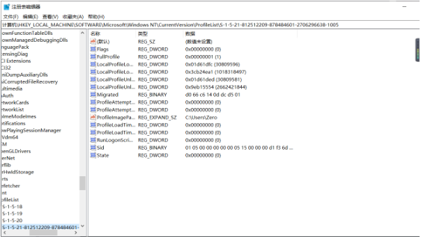 定位到HKEY_LOCAL_MACHINE\SOFTWARE\Microsoft\Windows NT\CurrentVersion\ProfileList
